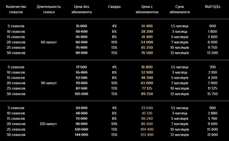 | 5 сеансов 10 сеансов 15 сеансов 20 сеансов 25 сеансов 30 сеансов | 60 минут | 40 000 60 000 80 000 100 000 120 000 | 4% 6% 8% 10% 13% 15% | 19 200 37 600 55 200 72 000 87 000 102 000 | 1,5 месяца 3 месяца 5 месяцев 7 месяцев 10 месяцев 12 месяцев | 800 2 400 4 800 8 000 13 000 18 000 |
