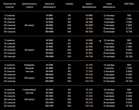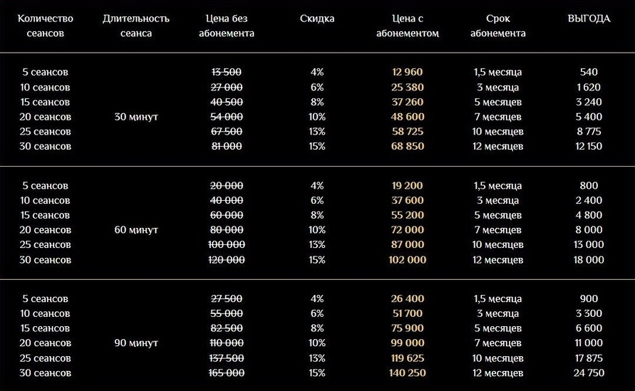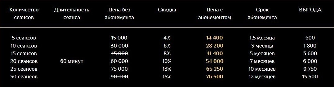| Количество сеансов | Длительность сеанса | Цена без абонемента | Скидка | Цена с абонементом | Срок абонемента | ВЫГОДА |